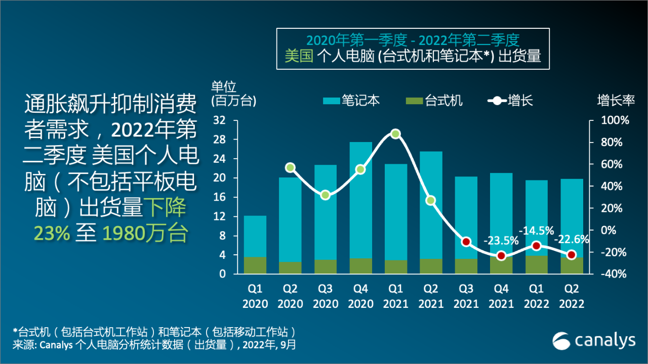 Canalys:2022 年第二季度美国个人电脑出货量下跌 23%