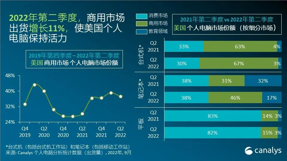 Canalys 的研讨分析师 Brian Lynch 表明:“美国台式机和笔记本的出货量已接连四个季度呈现下降。虽然如此,与疫情前比较,整体出货量依然维持在高位。虽然面对各种不利因素,如不断加重的通货膨胀、教育商场饱满以及近来因我国疫情封闭导致的供给问题等等,但该商场依然相对健康。顾客研讨显现,当时的通货膨胀率处于前史最高位,一旦这种高通胀状况得到操控,那么该细分商场便有或许复苏。商用收购体现微弱,占上一季度悉数出货量的一半。到目前为止,该细分商场没有遭到或许呈现阑珊的困扰。虽然整体宏观经济数据欠安,失业率仍维持在 3.5%,与 20 年来的最低失业率相等。一些公司现已发布了大规模裁人的音讯,但招聘人数仍是求职人数的两倍,为商用范畴不会在短期内呈现严峻下滑供给了一些活跃信号。”