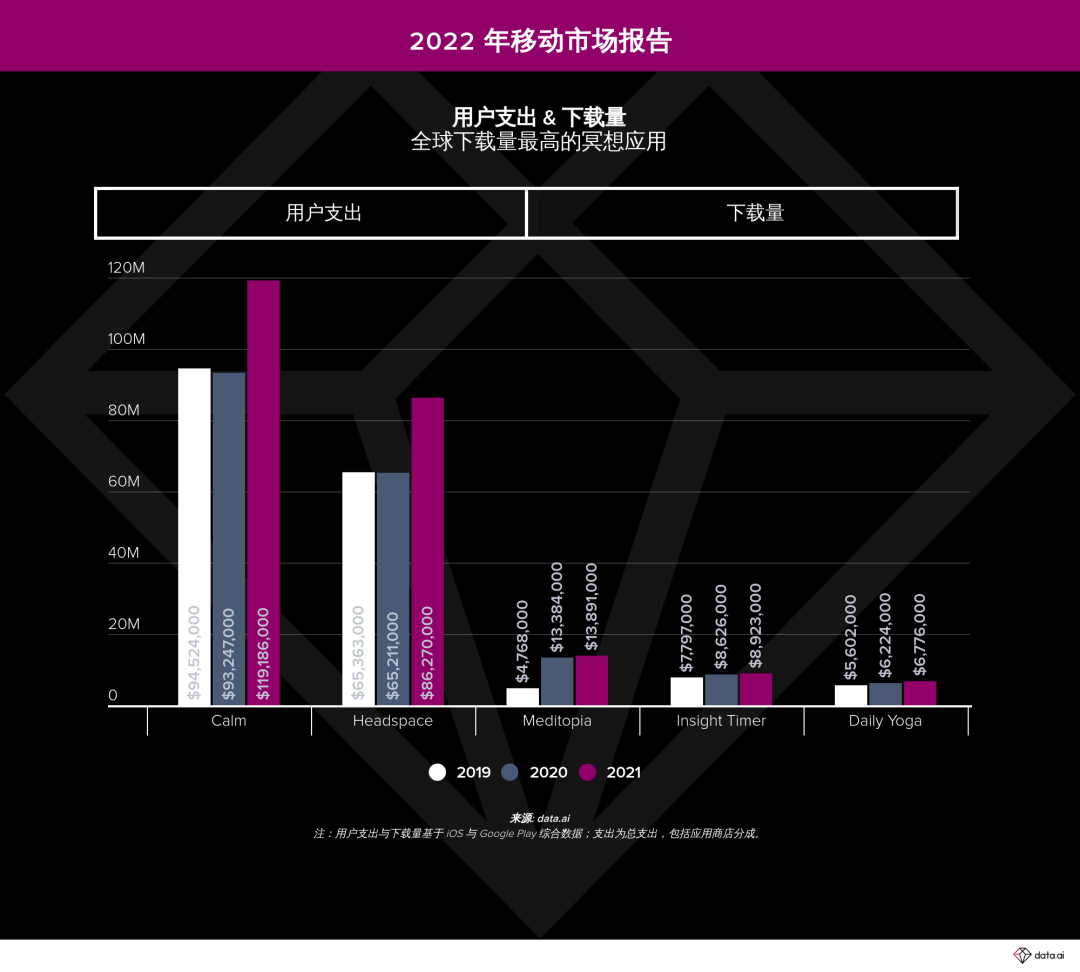 在运用商铺开销方面,排名前五的冥想 App 相较上一年同比增加了 25%。2021 年,用户开销最高的两款冥想 App:Calm 和 Headspace 共创收 2.05 亿美元。但是值得注意的是,这不是移动端仅有的变现途径,一些 App 还利用了运用内广告、企业协作或与移动电子商务相得益彰等途径。