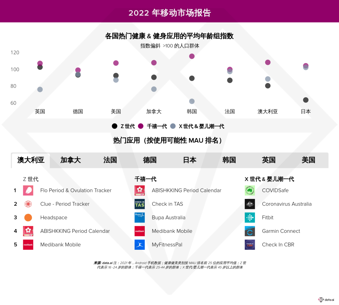 《2022 年移动商场陈述》还提醒了健康和健身 App 范畴的用户特征差异。一般来说,这是一个以千禧一代为中心的运用类别。在 2021 年,他们比 Z 代代或 X 代代和婴儿潮一代的总人口比较最倾向于健康和健身 App。例如,在韩国,上一年月活泼用户排名前 20 的健康和健身 App 中,千禧一代的均匀指数为 120。这意味着在韩国,千禧一代运用健康和健身 App 的或许性比全体人口均匀高出 20%(至少从月活用户数来看,前 20 款 App 都是如此)。