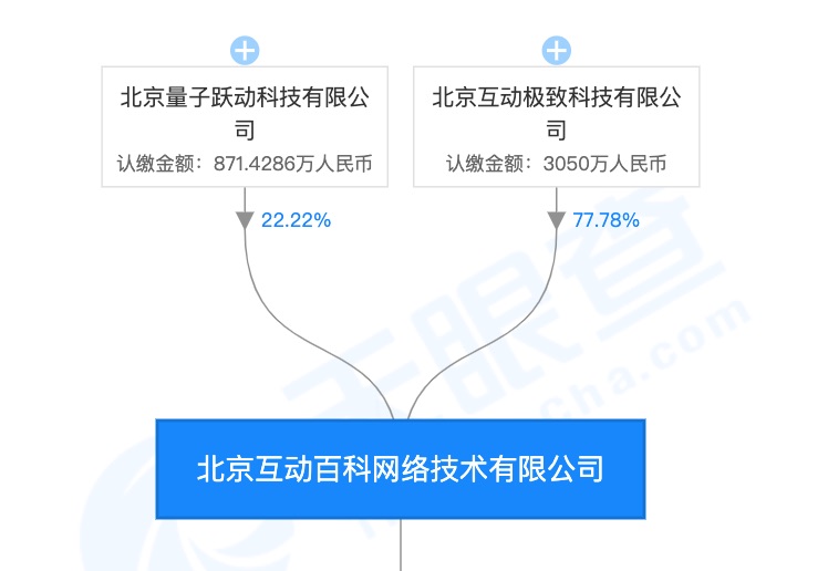 的数据,字节跳动已完成对互动百科的全资收买。互动百科所属公司北京互动百科网络技术股份有限公司的大股东为北京互动极致科技有限公司,占股 77.78%,第二大股东为北京量子跃动科技有限公司,占股 22.22%。这两股东均由北京字节跳动科技有限公司 100% 持股。