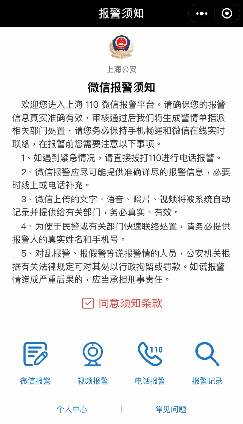 报警渠道,并在今日开端试运行,用户能够经过“上海 110”微信小程序报警。用户打开小程序后需求先勾选赞同报警须知条款,才干运用微信报警或视频报警功用。依据小程序中的描绘,微信报警便是以文字对话方式进行报警,视频报警则是与警员进行视频通话。用户还能够在“报警记载”中检查报警的处理状况。