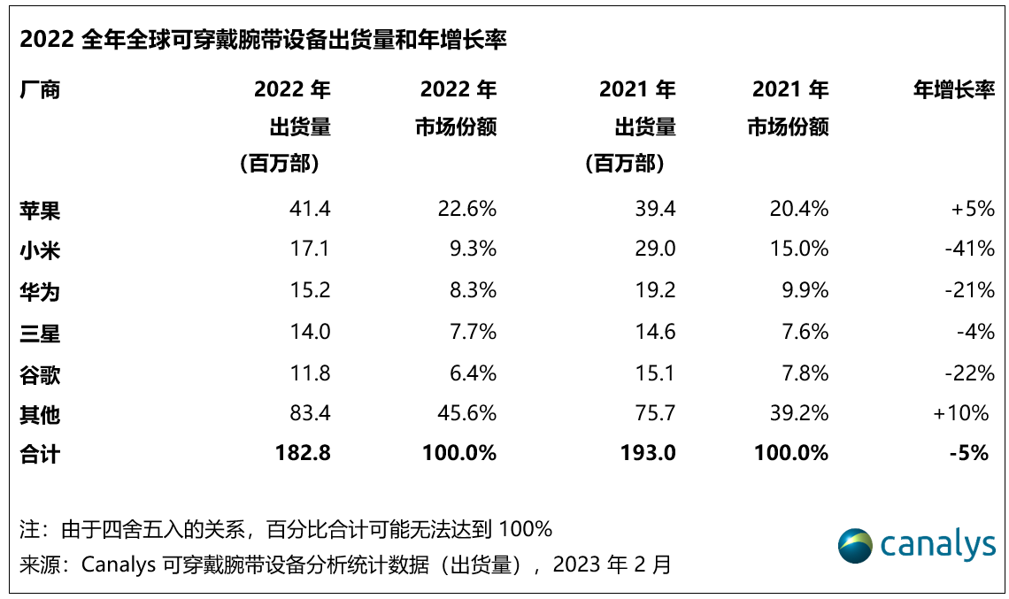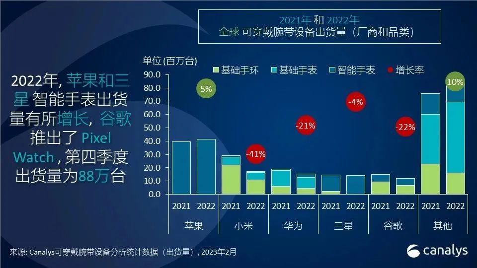 2022 年全体来看,智能手表增加 3%,根底手表增加 21%,根底手环跌落 39%,导致整个可穿戴腕带设备商场下降 5%。